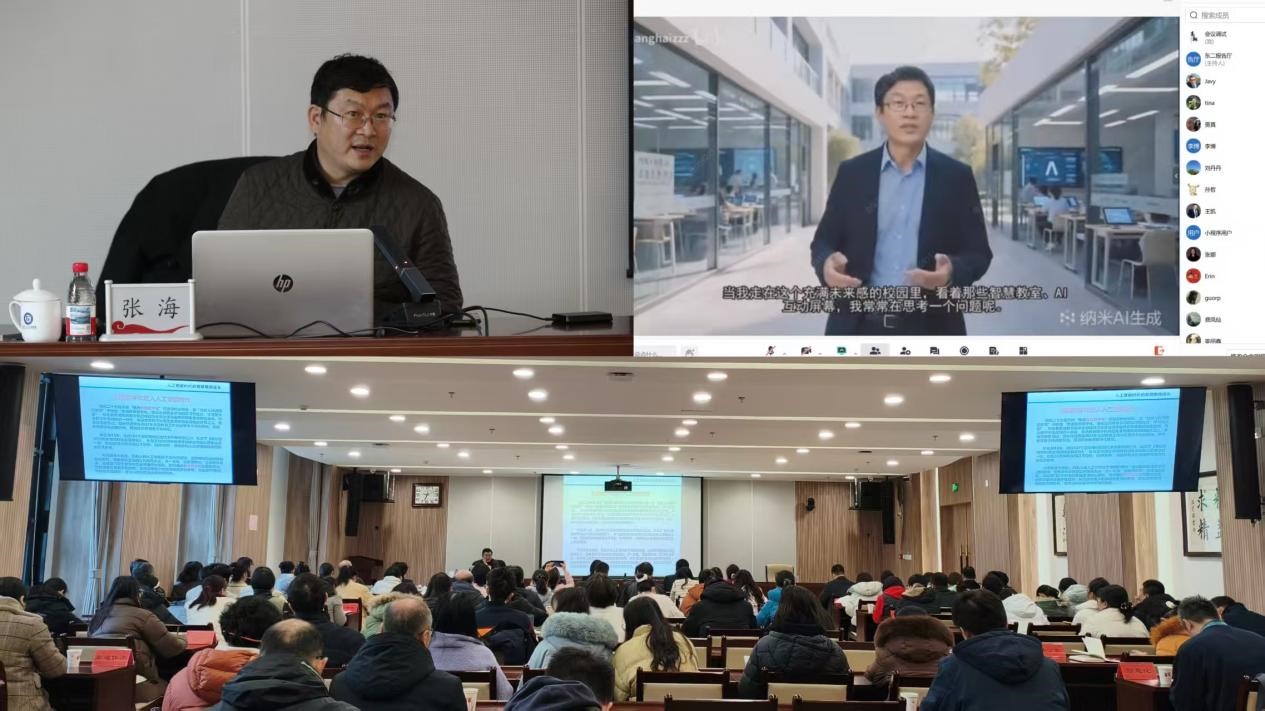 上午的培训环节,张海教授以“人工智能赋能教与学变革”为题,作了一场视野开阔、内容详实的专题报告,报告立足技术前沿、贴近教育实际,为全体教职工理解智能技术、启迪教学改革提供了重要引导。本次活动还同步开设线上分会场。