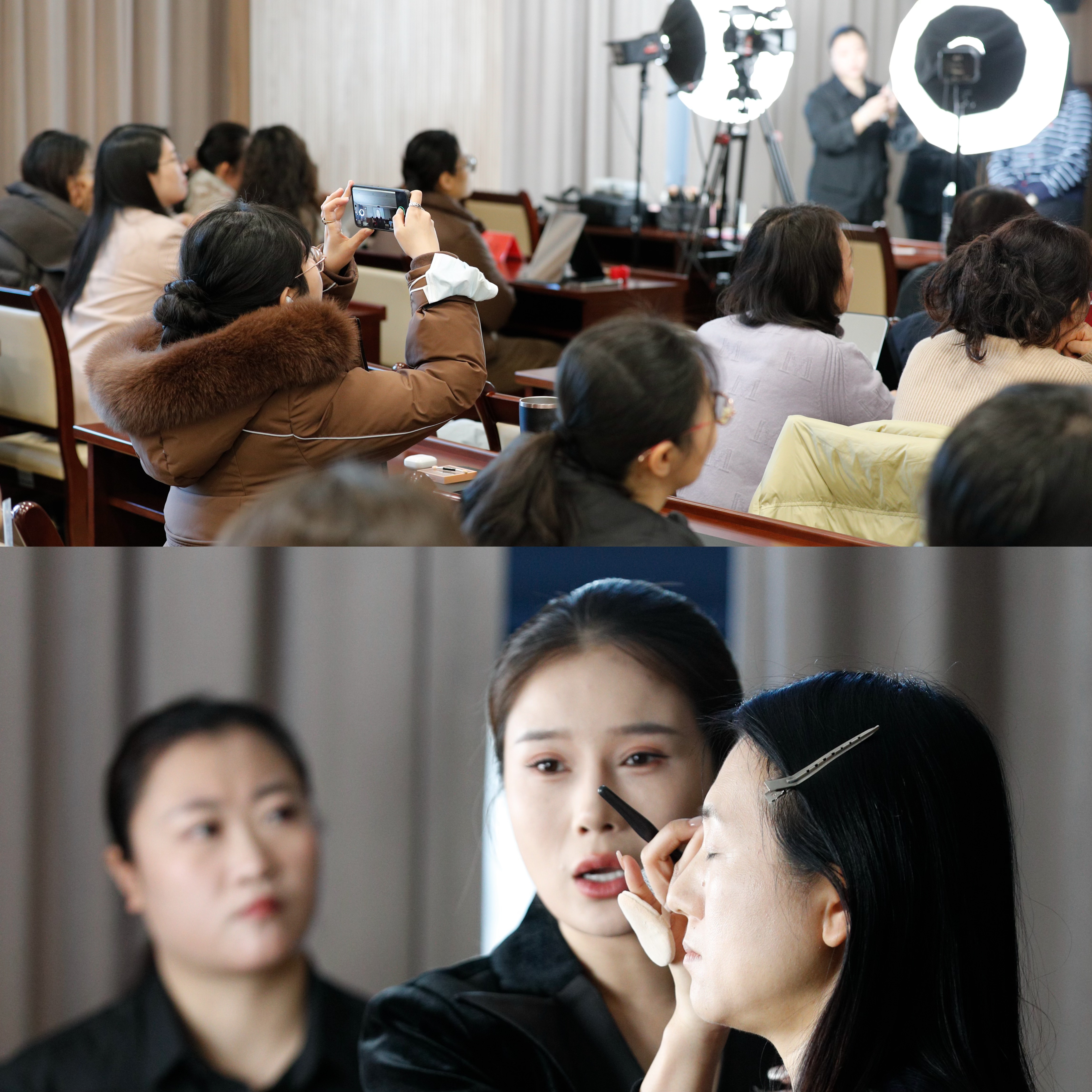 活动特邀资深妆造老师授课,助力女教职工掌握实用工作妆技巧。课堂上,老师秉持“简洁、实用、显精神”的原则,从底妆打底到五官修饰逐一细致讲解,并开展一对一实操指导。女教职工们在老师的巡回辅导下完成妆容步骤,现场氛围热烈温馨。定妆拍照环节,女教职工精致的妆容映衬着灿烂的笑容,尽显从容自信的独特风采。