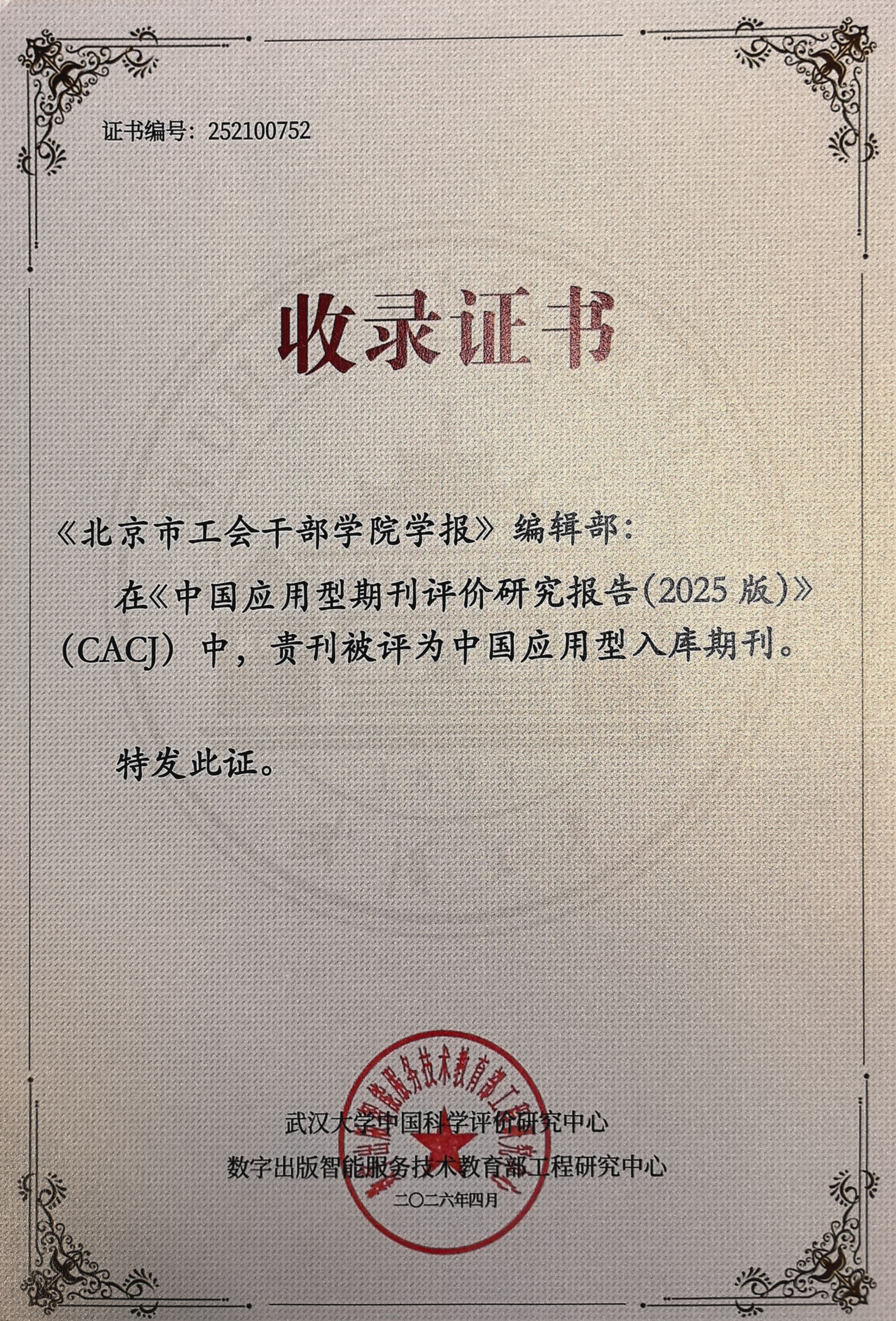 近日,由武汉大学中国科学评价研究中心、数字出版智能服务技术教育部工程研究中心联合研发的《中国应用型期刊评价研究报告(2025版)》正式发布。《北京市工会干部学院学报》首次参评并成功获评“CACJ中国应用型入库期刊”。这是我校学报主动走出校门、接受社会评价的重要突破,也是服务学校高质量发展取得的又一积极成果。